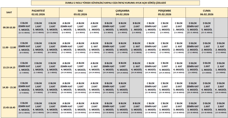 - Tüm hükümlü ve tutuklular için; Şubat Ayı Açık Görüş tarihleri 02/02/2026 - 06/02/2026 tarihleri arası olarak belirlenmiştir.