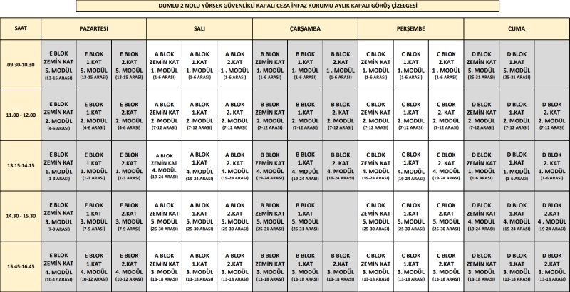 - Hükümlü ve Tutukluların Ziyaret Edilmeleri Hakkında Yönetmelik’in 5. maddesinin birinci fıkrasının (d) ve (f) bentleri uyarınca kurumumuzda bulunan hükümlü ve tutuklulara 01/02/2026 – 28/02/2026 tarihleri arasında bir hafta açık görüş, ayın diğer haftaları ise kapalı görüş yaptırılması, ağırlaştırılmış müebbet hapis cezasından hükümlü olanlara ise bir kez açık bir kez kapalı görüş yaptırılması uygun görülmüştür.