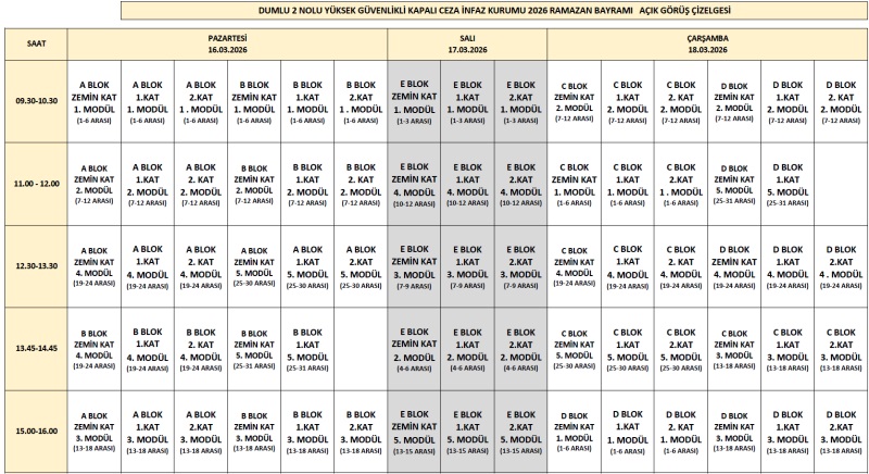 - Hükümlü ve Tutukluların Ziyaret Edilmeleri Hakkında Yönetmeliğinin 9. ve 11. Maddeleri gereğince belirlenen 6 yakını ve 0-6 yaş aralığındaki hükümlü ve tutuklunun kendi çocukları ile görüşmesi adı geçen yönetmeliğin 10. Maddesi uyarınca kurum idaresi tarafından kararlaştırılmıştır.