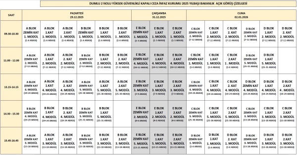 - Hükümlü ve Tutukluların Ziyaret Edilmeleri Hakkında Yönetmeliğinin 9. ve 11. Maddeleri gereğince belirlenen 6 yakını ve 0-6 yaş aralığındaki hükümlü ve tutuklunun kendi çocukları ile görüşmesi adı geçen yönetmeliğin 10. Maddesi uyarınca kurum idaresi tarafından kararlaştırılmıştır.